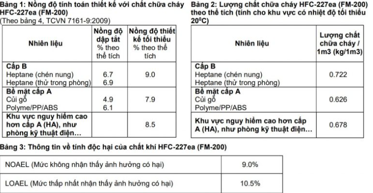 Chất khí chữa cháy HFC-227ea (FM-200) được tính toán theo TCVN 7161-9:2009 hoặc các tiêu chuẩn quốc tế khác.