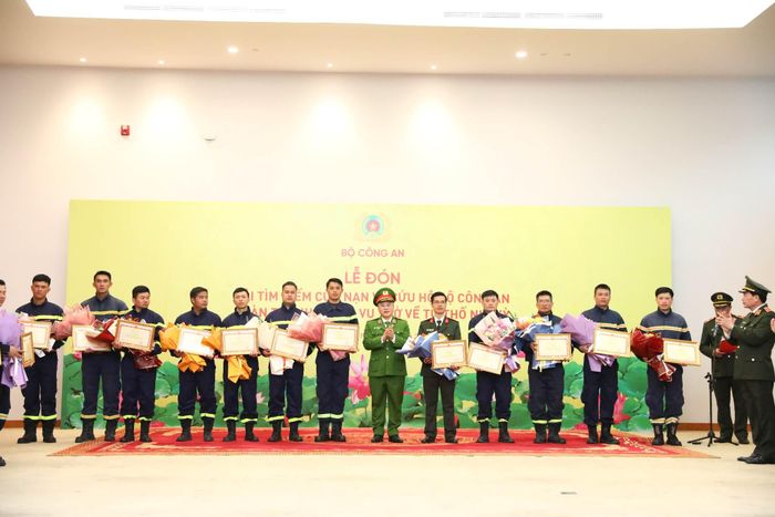 Tại lễ đón đoàn công tác, Trung tướng Lê Quốc Hùng trao bằng khen của Bộ Công an cho 24 cán bộ, chiến sĩ đã hoàn thành xuất sắc nhiệm vụ quốc tế được lãnh đạo Bộ giao.